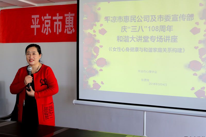 講座由平?jīng)鍪行睦韺W(xué)會(huì)會(huì)長(zhǎng)、國(guó)家執(zhí)業(yè)醫(yī)師、國(guó)家二級(jí)心理咨詢師、EAP高級(jí)講師張素珠老師主講,張老師以“婦女心身健康與家庭及社會(huì)和諧”為主題,作了深入淺出,激情洋溢的講座,講座結(jié)合專(zhuān)業(yè)的學(xué)識(shí)和通俗的語(yǔ)言,系統(tǒng)講解了女性自出生到婚育各個(gè)成長(zhǎng)階段的心理健康養(yǎng)護(hù)和相關(guān)心理問(wèn)題矯正知識(shí),深入分析了女性心理發(fā)展與家庭、社會(huì)的關(guān)系,結(jié)合現(xiàn)實(shí)案例解答了普通家庭生活中常見(jiàn)的心理和家庭關(guān)系問(wèn)題。