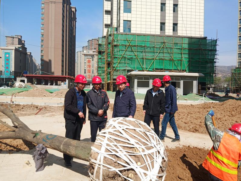 2021年4月19日,公司黨委委員、副總經(jīng)理魏顯文對平?jīng)鲆恢行滦^(qū)及御景華府商品房建設項目綠化施工進行了現(xiàn)場督查,查看了苗木質(zhì)量、施工技術(shù),聽取了現(xiàn)場負責人對施工情況的匯報,并在御景華府項目工地召開了種植土方回填、微地形堆筑、苗木進場栽植施工現(xiàn)場會議。