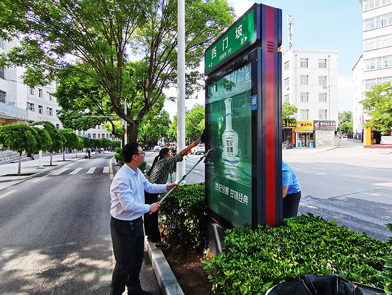 活動中,全體員工分組前往西門坡、文化街、石家巷、西大街等城區主干道,對道路指示牌進行了認真細致的清洗,鏟除清潔了粘貼的小廣告,對廣告設施內部電子元件做了維護保養,確保箱體無積塵、無亂涂畫、無亂張貼等現象,以實際行動為創建文明城市和公司發展貢獻力量。