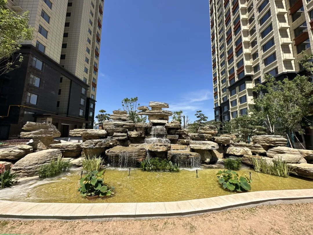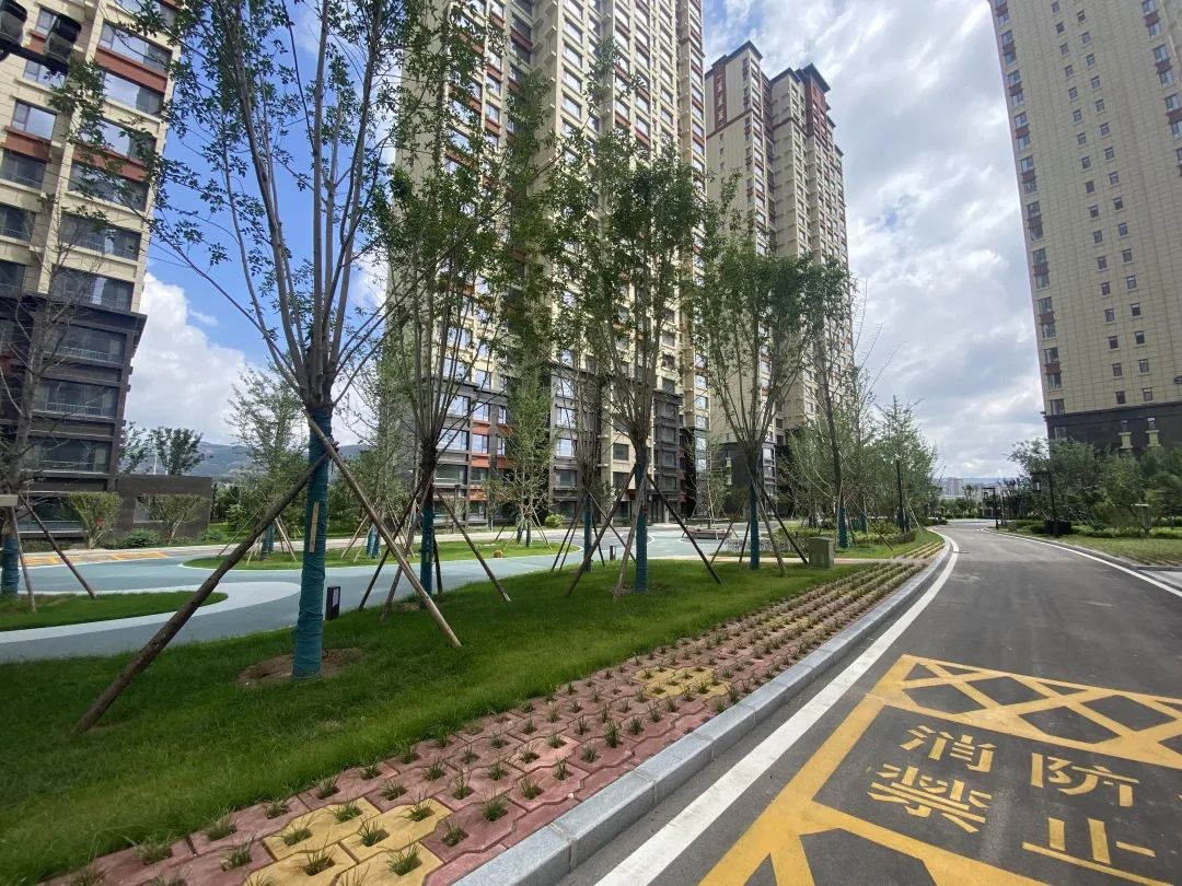 小區主入口路面采用花崗巖石材配祥云文化地雕,高低錯落有致,如一幅畫卷徐徐展開。新中式大門高端大氣,氣勢恢宏。項目北側為涇河干流綜合治理項目兩路綠化工程,漫步于綿延不絕的綠色長廊,盡情呼吸空氣中的負氧離子,臨河水邊嬉戲,于公園中游玩。由北側入苑后印入眼簾的是一幅淡墨山水畫境,兩側以錯落起伏的波浪草丘為山,營造出鐘靈毓秀的山川大河之景。設計巧妙的利用了消防登高場地透水混凝土作為活動健身廣場和超級植草地坪相結合,既滿足消防要求的同時又提升了小區品質。小區綠化率高達37.15%,喬、灌木搭配種植,高低錯落、疏密有致、四季常綠、季季有花。開窗可見綠,出門可踏青,環境宜人。