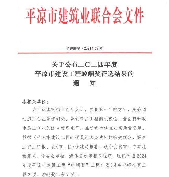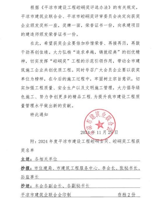 11月29日,由城建投公司施工建設(shè)的興瑞家園1#2#樓二標(biāo)段工程,榮獲2024年度平?jīng)鍪薪ㄖこ獭搬轻吉?jiǎng)”。