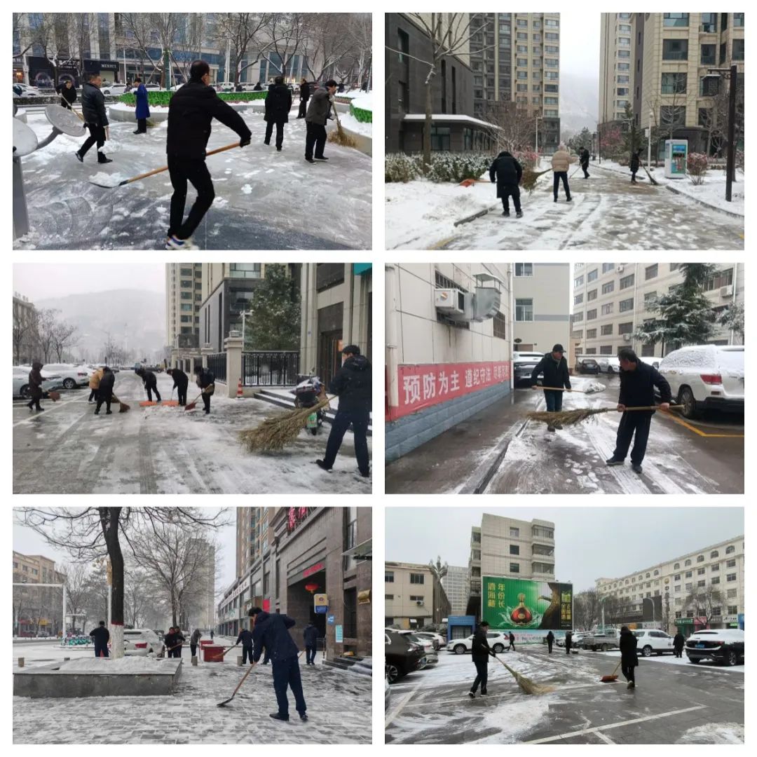 各經(jīng)營服務單位身先士卒,不畏嚴寒,頂著風雪,利用手中的雪鏟、鐵锨、掃帚等工具,互相配合,分工合作,熱火朝天的勞動場面讓寒冷的天氣顯得暖意濃濃。在群眾出行前,已將區(qū)域主要道路和人行道積雪清掃干凈,用實際行動驅(qū)散雪天嚴寒,為群眾清掃出一條“安全路”,開辟出一條“暢通路”。