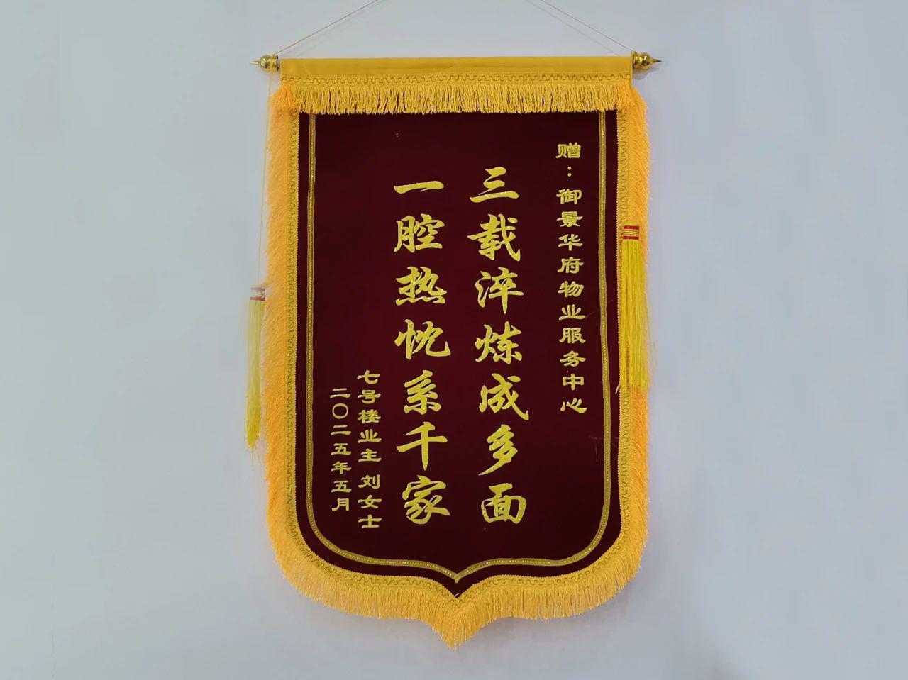 5月26日,御景華府小區業主劉女士向物業服務中心贈送了一面繡有“三載淬煉成多面,一腔熱忱系千家”的錦旗,并附上一封感謝信。