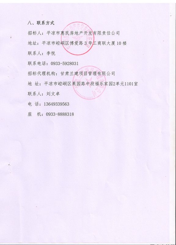 2.投標文件遞交地點為:平涼市惠民房地產開發有限責任公司會議室(平涼市崆峒區博愛路3號工商聯大廈11樓)。