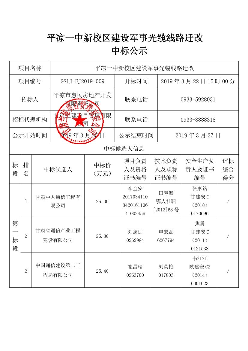 平?jīng)鲆恢行滦^(qū)建設(shè)軍事光纜線路遷改中標(biāo)公示