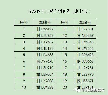 為了維護公平、公正、良好的停車秩序,我公司將2021年11月1日至2022年2月18日以來累計欠費金額較大的車輛信息匯總進行第七批公示(前六批公示車輛除外),請各位車主于2022年2月25日前及時補繳所欠停車費;逾期未補繳的,公司將欠費信息報送“信用崆峒”平臺公示;并對逾期仍未繳清欠費的車主通過法律途徑予以追繳,將會對個人征信產生嚴重影響。