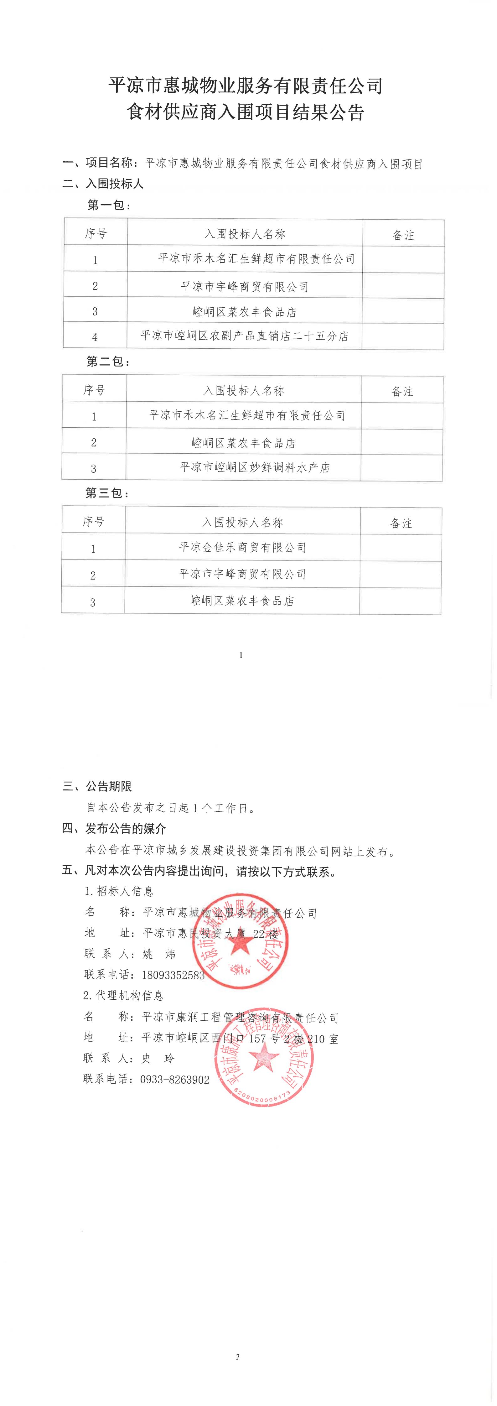 平?jīng)鍪谢莩俏飿I(yè)服務(wù)有限責(zé)任公司食材供應(yīng)商入圍項目結(jié)果公告