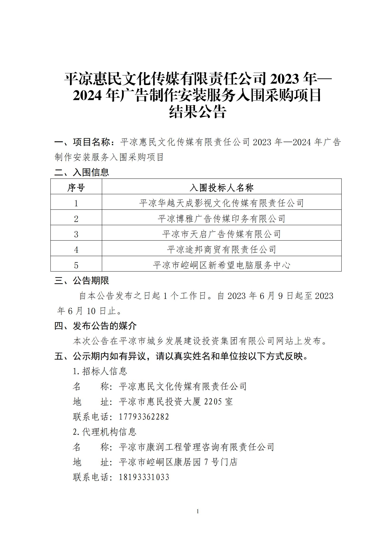 平涼惠民文化傳媒有限責任公司2023年—2024年廣告制作安裝服務入圍采購項目結果公告